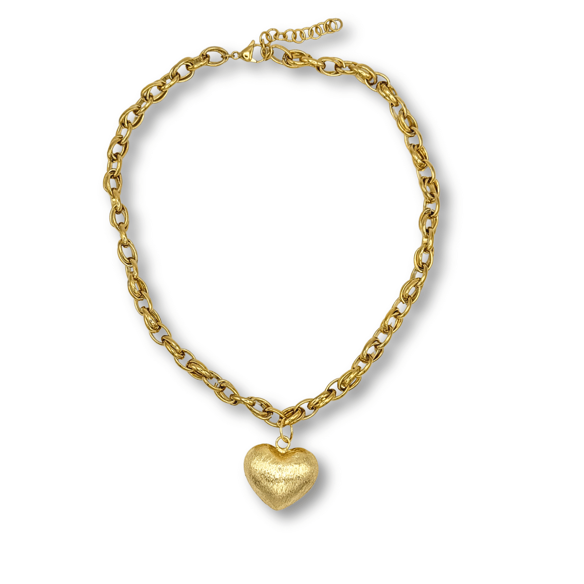 Make a statement without saying a word. This gold heart necklace features an oversized puffer heart pendant that brings instant dimension to any look.  Beautifully hanging from a chunky chain that looks substantial yet is light in weight. The 18K gold plating over stainless steel gives you that luxe, warm glow while ensuring durability that keeps up with your everyday.